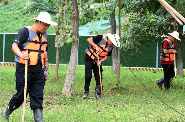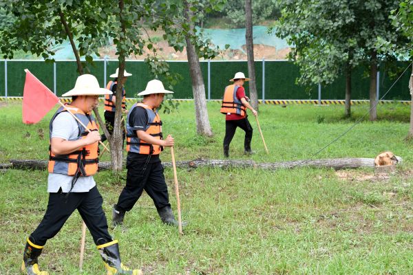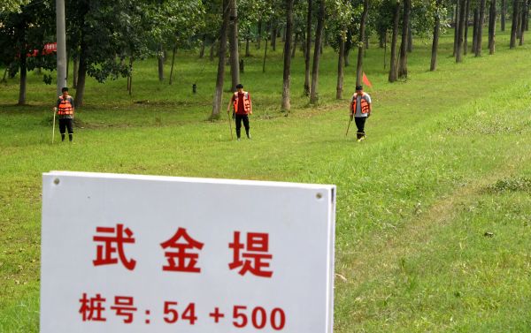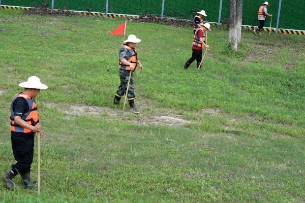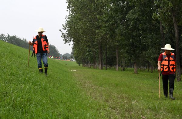 长江网7月10日讯 7月10日,在武金堤洪山段,来自华中农业大学防汛突击队的队员们拿着木棍并排在堤岸坡行走,时而用手中的木棍扒开草丛仔细察看是否有渗水、鼓胀、漏洞等,检查是否有管涌隐患。据队员们介绍,岸坡草丛里湿滑,有蛇出没,长竿具有防滑、探路、驱蛇三重功效,成为巡堤防汛必备工具。记者李子云 摄影报道