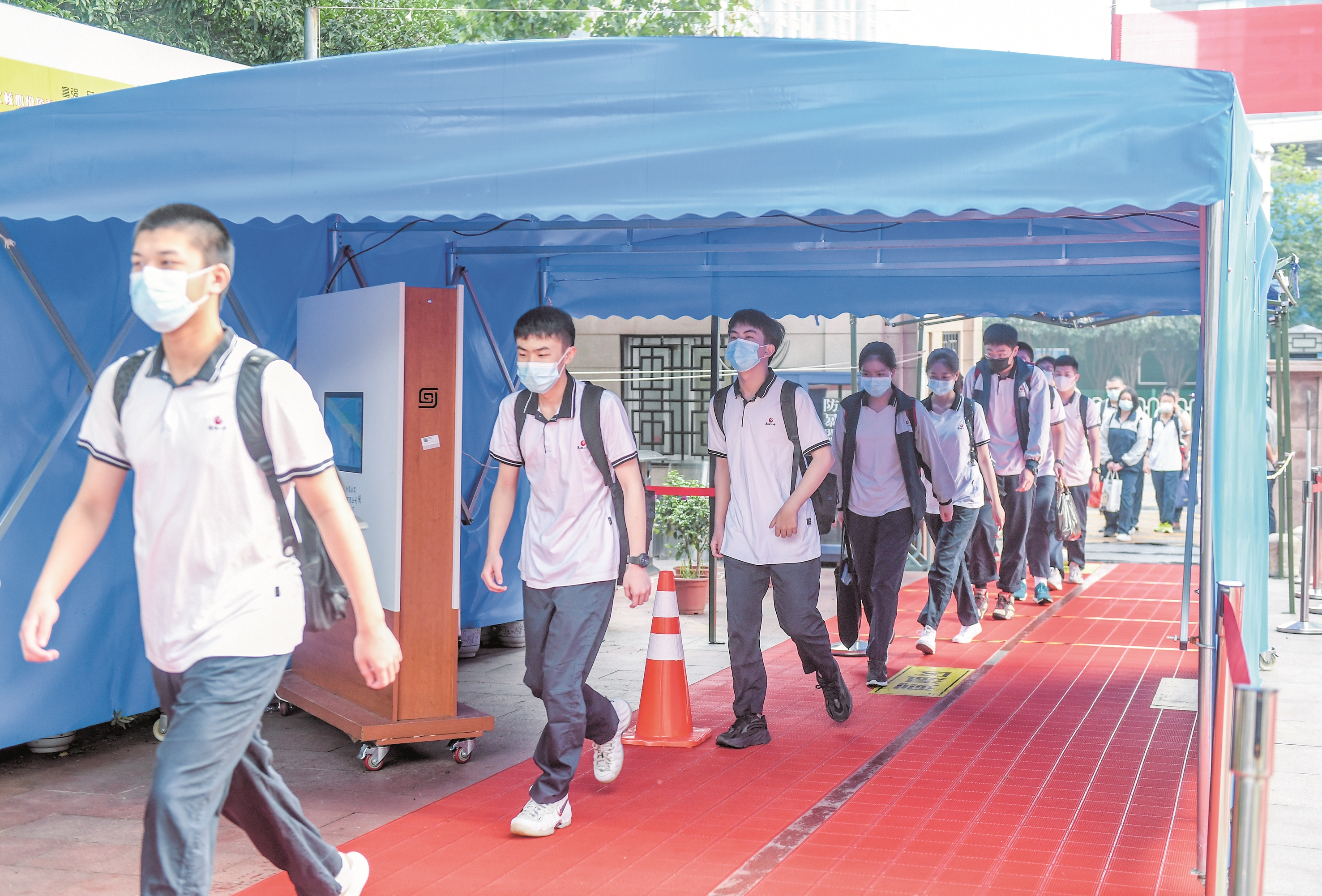 在武汉市第四十九中学“三春晖”测温点门前,高一高二学生有序返校上课。7月10日——11日这两天,该校将对学生居家学习状况进行摸底检测调研,严禁年级将检测用于学生排名排序。与此同时,还面向学生和家长开展问卷调查,对学生居家学习期间思想、生活、学习等情况进行调研。