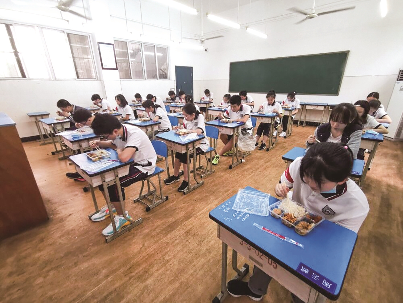 袁景云介绍,学生每天至少进行三次体温检测。午餐和晚餐为避免人员聚集,会将一部分学生有序安排到高三年级空教室就餐,并由一名老师全程陪餐。