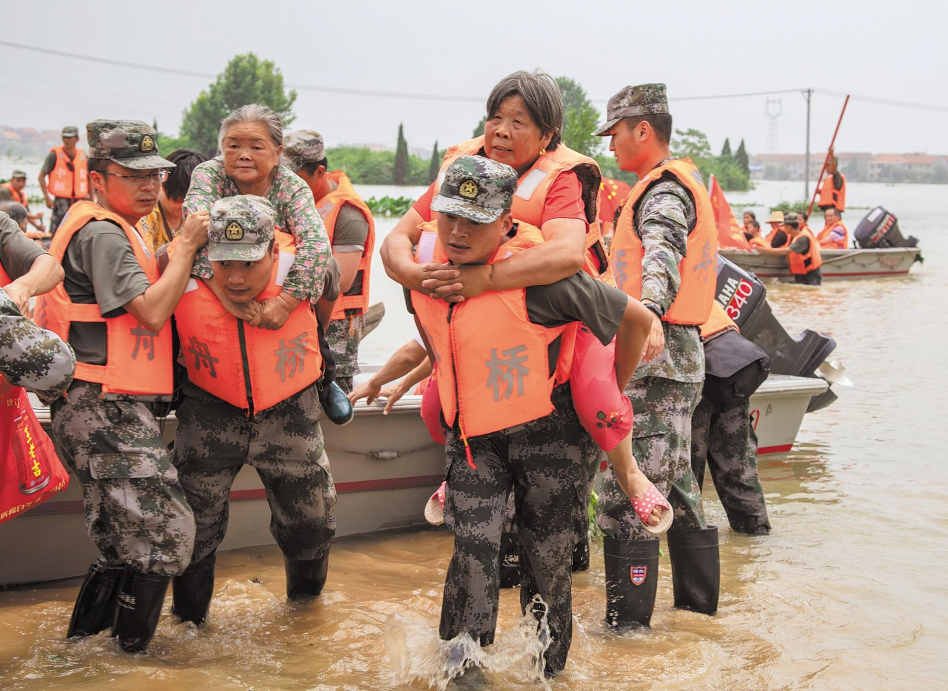 该村被洪水围困,300多名老弱病残、妇女儿童需要紧急转移。中部战区陆军某舟桥旅官兵150人,携带冲锋舟等救援物资迅速赶到现场,与镇、村干部和民兵一起,挨家挨户将受困群众转移出村。 (湖北日报全媒记者 魏铼 通讯员 程小冬 摄)