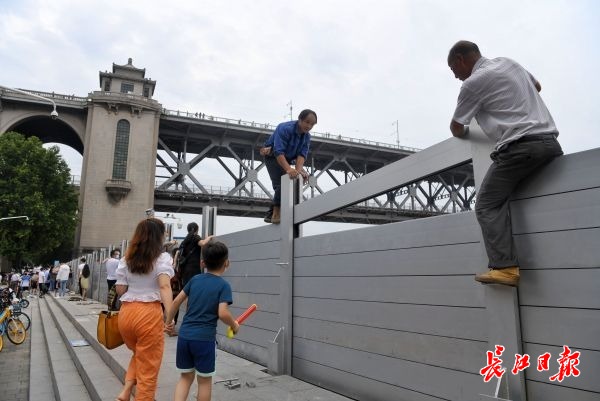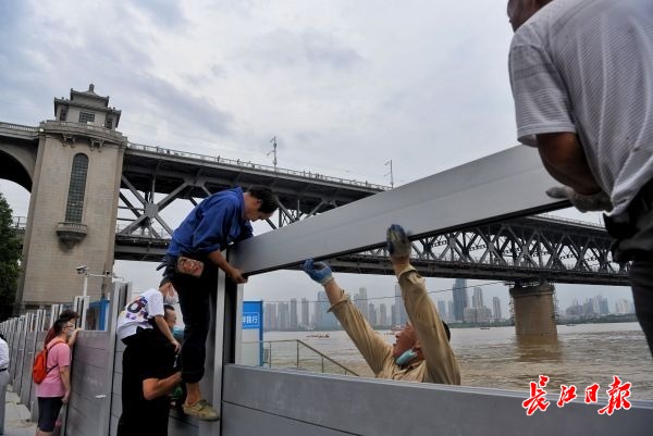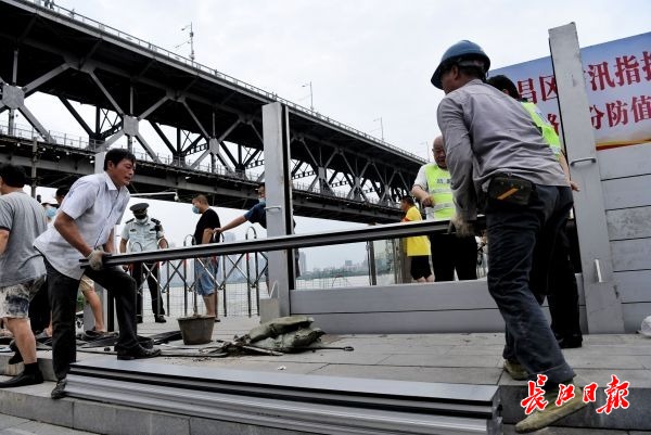 长江网7月11日讯 2020年7月11日下午,武昌临江大道汉阳门,防汛工作人员加紧拼装防洪板,全力保障堤防安全。(记者苗剑 摄影报道)