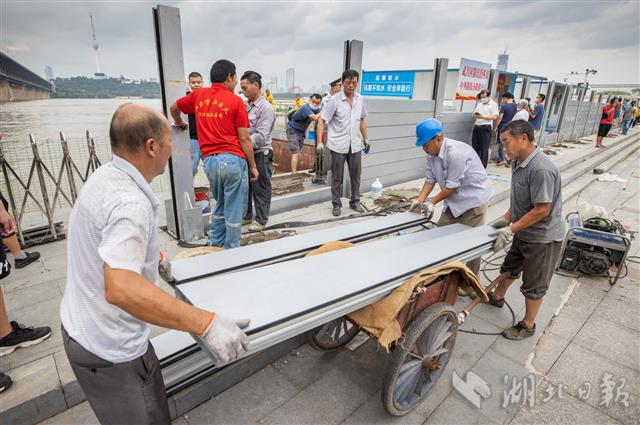 7月11日,武汉长江大桥武昌桥头堡旁,值守人员在安装拼装式防洪墙。