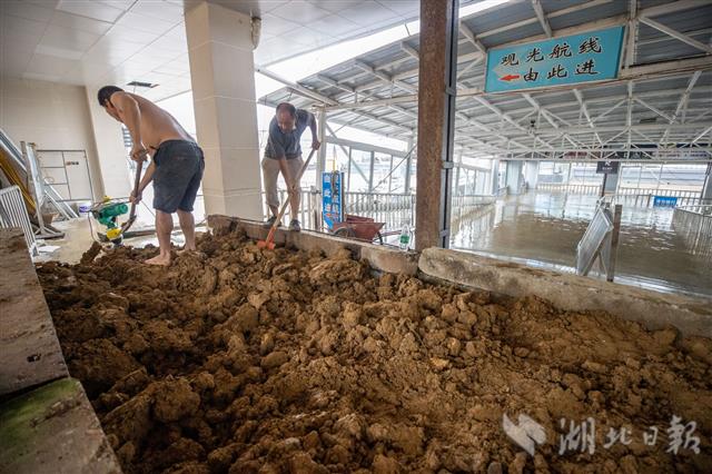 7月11日,值守人员在武汉中华路1号码头封堵闸口的闸条间加填黄土。