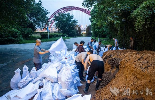 7月11日,武汉南岸咀江滩公园,防汛人员填装黄土袋,准备封堵闸口。