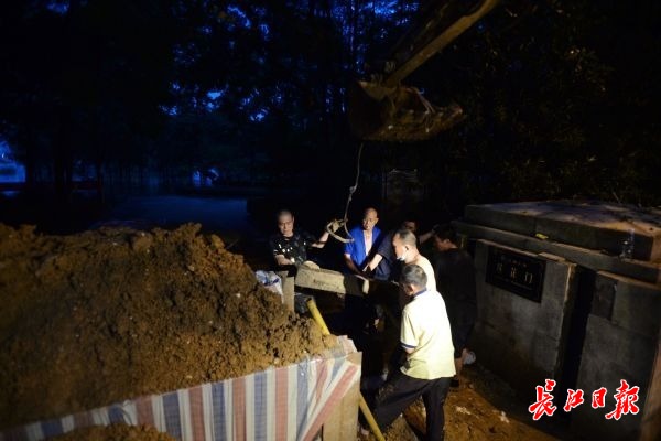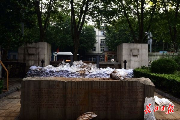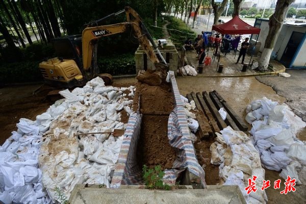 长江网7月11日讯 2020年7月11日晚,汉阳江滩四号闸口大禹神话园莲花门经过昼夜奋战,即将完成围堰封堵。 (记者胡冬冬 摄影报道)