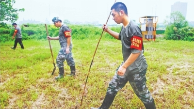 换上深筒套鞋,拿起长竿,一到堤上,周亮宇就变得干劲十足。周亮宇所在小队值守堤段长度为300米,距离不长,巡起来却并不轻松。背水面一侧是草丛树林,雨后路面格外泥泞湿滑。一些积水的坑洼隐藏在草叶之下,记者一不留神踩进坑里,整个脚背都陷进泥沼中,使劲才能拔出。坡面上还有不少竖直插入的枝丫,走上去扎得脚底板疼。大家深一脚浅一脚地前行,走了几分钟后背就汗湿了。