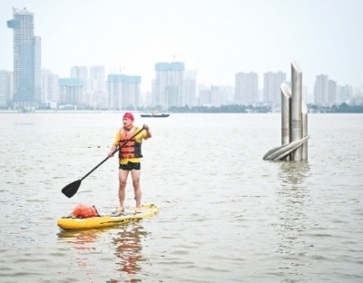 11日,一名长江救援队队员在汉口江滩江面上巡逻。随着江水持续上涨,汉口江滩的二级亲水平台已被江水淹没,江水接近最高的28.8米三级亲水平台。