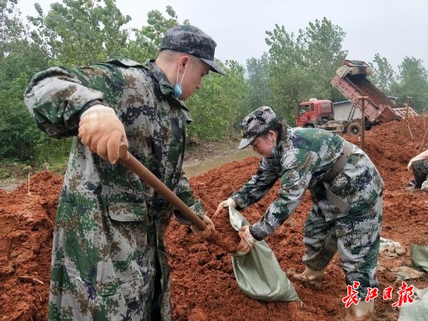 据介绍,她们来自江岸区车站街街道办事处,一个叫陈化,一个叫石丽娟。上午8时,作为女民兵,她们奉江岸区人武部防汛命令,与400多位战友一起赶到这里,加固堤防。朱家河是长江的支流,近期河水泛滥防汛压力较大,需要修筑一条临时防汛设施。