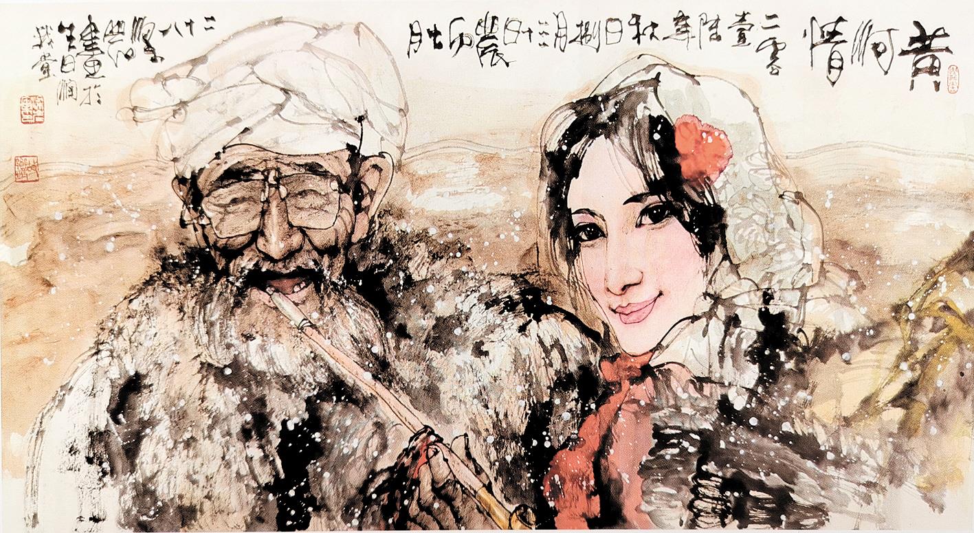 艺术家的情感是丰富的,梁岩的作品中,不仅有刚健仁爱的阳刚之美,也有清新雅丽的柔和之美。在《爷孙图》《吹泡泡》《梦》《飞雪迎春到》《山里春秋》《春到深山》等作品中,常常可以看到,饱经风霜的老人和纯真可爱的孩童,出现在同一画面中。梁岩人物画,表现对象不同,艺术处理方法也不同,用笔用墨以人物特征来定夺。表现饱经风霜的老人,他往往用厚重的笔法加上墨的皴擦,体现出沧桑感;表现孩童、少女,则用充满水分的笔触恰如其分地把女性、孩童的肌肤、质感表现出来,显得柔和淡雅。这种鲜明的对比,显现出梁岩驾驭人物造型的能力,并作为一种独特的个人风格,在全国画坛独树一帜。梁岩曾多次赴西藏、新疆采风写生,创作了《藏族兄弟》《撒尼女孩》《高原雪》《摩梭女》《赶街的彝族妇女》等少数民族人物题材画作。