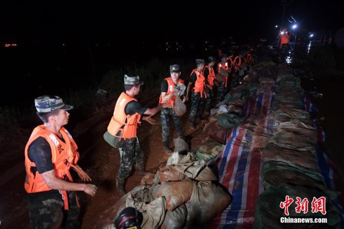 资料图:武警官兵在江西鄱阳县抗洪一线搬运沙袋。 许书灿 摄