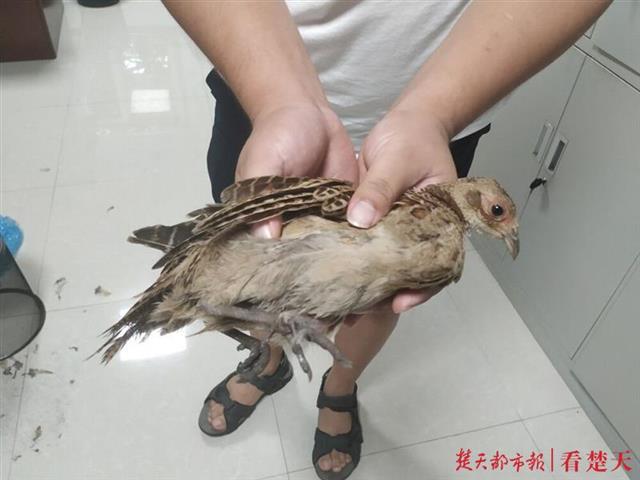 楚天都市报7月12日讯(记者张万军)12日下午,一只环颈雉(俗称野鸡)误闯入武昌区四美塘路一家公司办公室,难以脱困,幸被一位热心市民救助后放生。