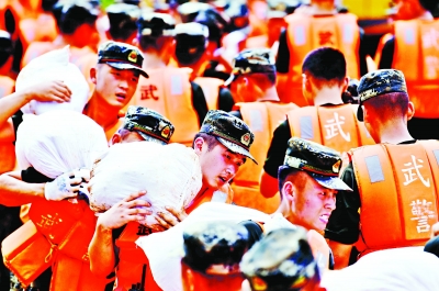 武警官兵搬运沙袋。