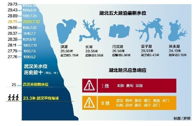 湖北雨情近两日稍缓,但长江的水位仍然持续上涨。昨日,汉口站(武汉关)水位升至历史第四高的28.75米,预计洪峰14日到武汉,到时水位将有29.00米左右。