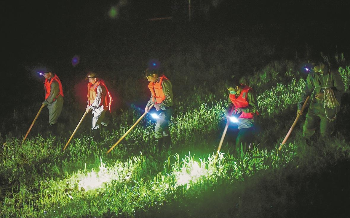 7月11日1:39 青山武惠堤值守点,防汛队员们拉网巡堤