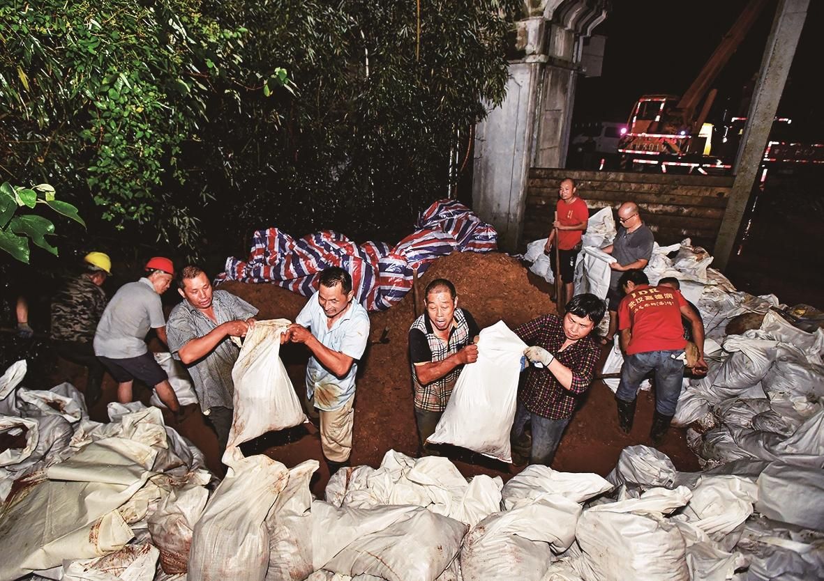 7月13日3:10 防汛队员抢填土袋,通宵封堵汉阳区高公街闸闸口