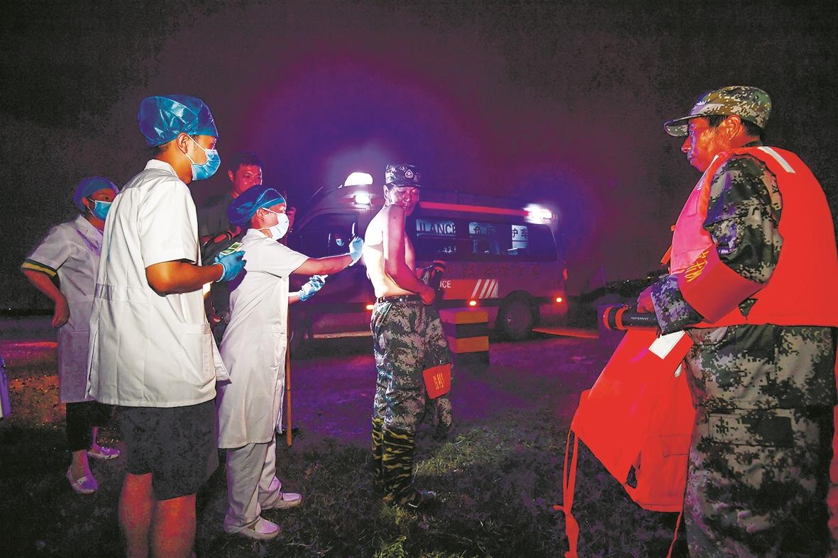 7月11日21:41 武科大医疗救援队在武金堤杨泗矶为巡堤队员处理伤口