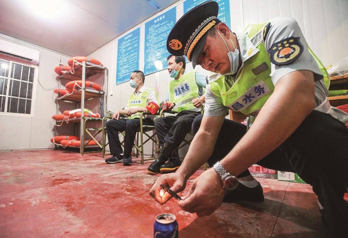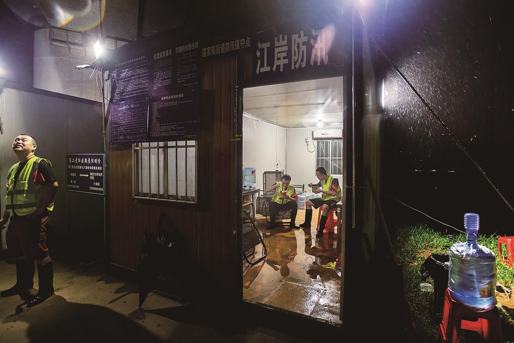 7月10日23:16江岸区谌家矶江堤,两名刚巡堤回来的湖北大学知行学院辅导员在值守点内泡面充饥