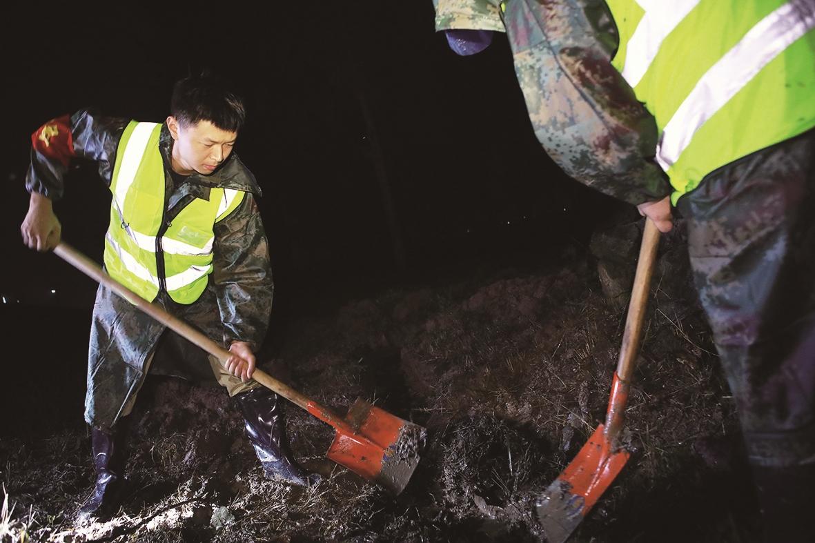 7月10日23:50 江夏长江干堤谭家窑值守点,遇到小型积水点,防汛队员迅速抢挖排水沟