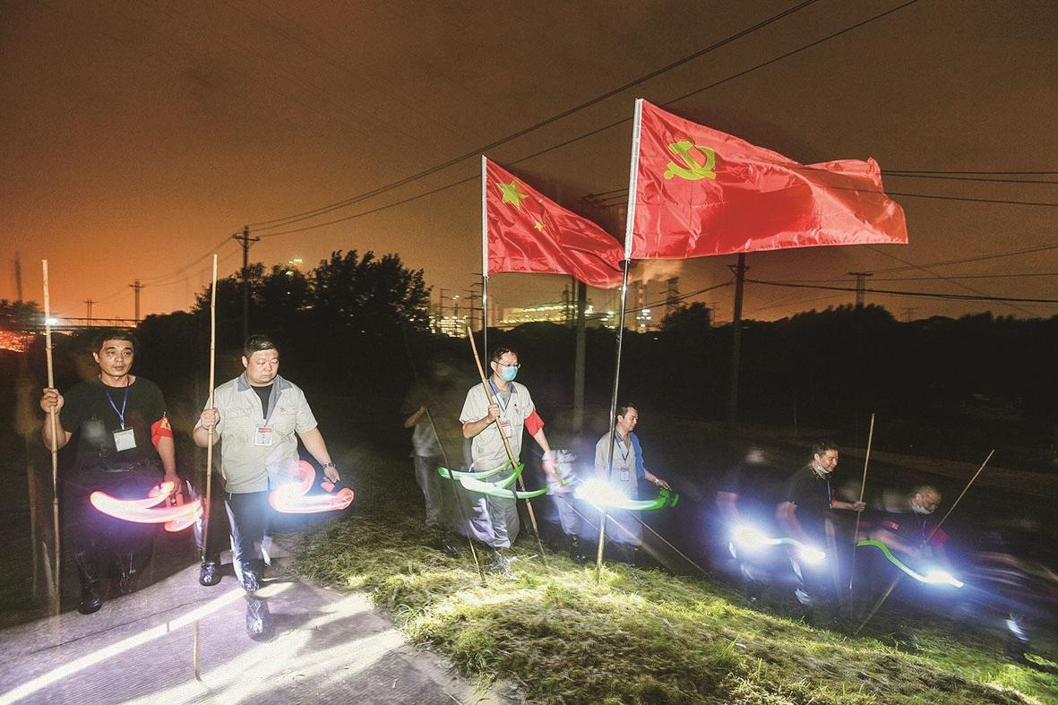 夜深人静,一碗热气腾腾的泡面,帐篷里的片刻小憩,让守堤人得到安慰。在他们的面前,江风肆虐,酷暑闷热,蚊虫叮咬,毒蛇出没;在他们的身后,灯火通明,党旗飘扬。