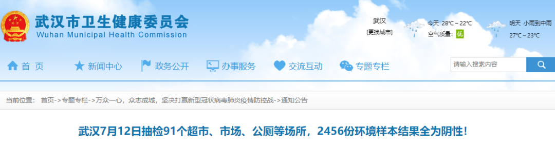 武汉7月12日抽检91个超市、市场、公厕等场所,2456份环境样本结果全为阴性!
