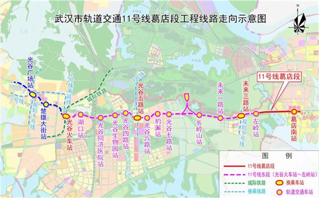 武汉地铁11号线三期葛店段工程串联了武汉市和葛店开发区,建成后,乘地铁从光谷火车站到葛店南站仅需40分钟,将有效提升武汉和鄂州出行效率及品质,促进葛店南站综合交通枢纽形成,加快城际轨道和城市轨道网的融合,实现两城同步互促、高质量一体化发展。