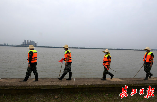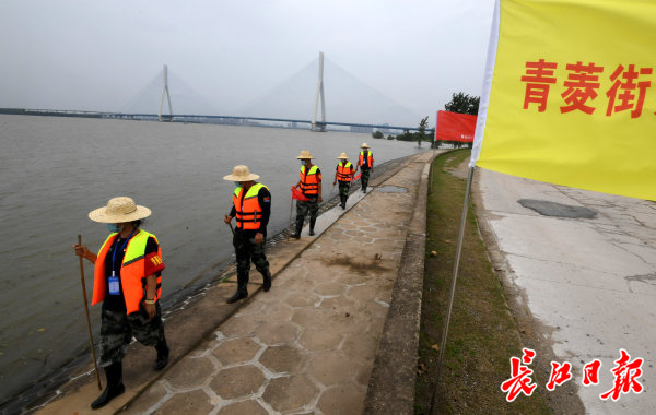 长江网7月13日讯 7月12日,在武金堤沌口长江大桥江段,来自洪山区青菱街防汛突击队的巡堤员穿着雨鞋、手持木棍、戴着草帽,相互间隔1.5米排开,分别在堤顶、堤坡、堤脚老练地开展拉网式巡堤查险工作,24小时守护大堤安全。
