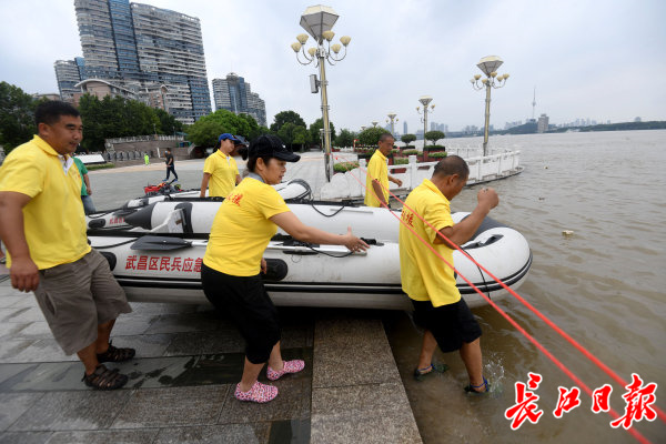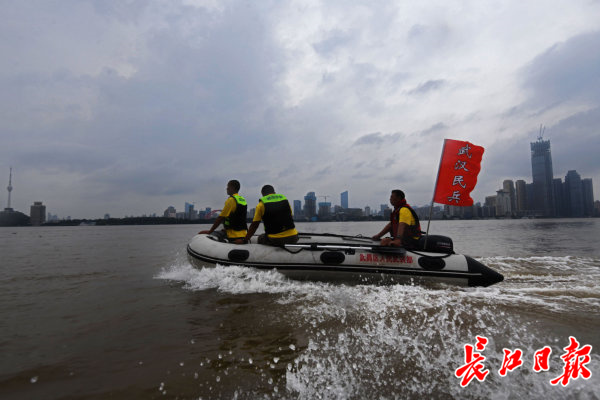 7月12日下午,武汉长江救援志愿队队员驾驶着冲锋舟巡江值守,确保市民群众生命安全。为应对即将到来的战汛突击抢险,目前,长江救援志愿队已召集了120名身强力壮、水性好的民兵(2016年成立民兵连),并添置救生衣、冲锋舟等防汛设备,随时听从有关部门召唤。11日,长江救援志愿队发出倡议,希望游泳爱好者和市民最近不要到长江游泳,希望各成员自我约束的同时,尽量劝导他人不要到长江和汉江中涉险。