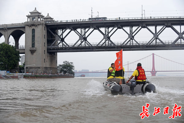 7月12日下午,武汉长江救援志愿队队员驾驶冲锋舟巡江值守。