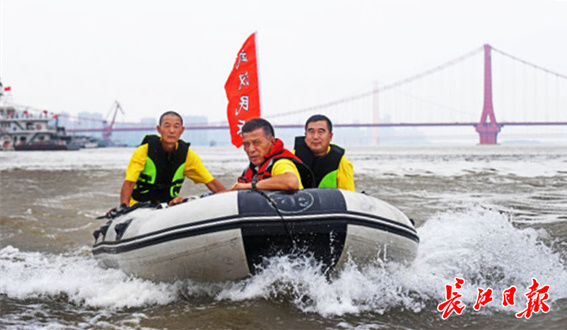 7月12日下午,武汉长江救援志愿队队长张建民(中)带队巡江值守。