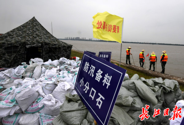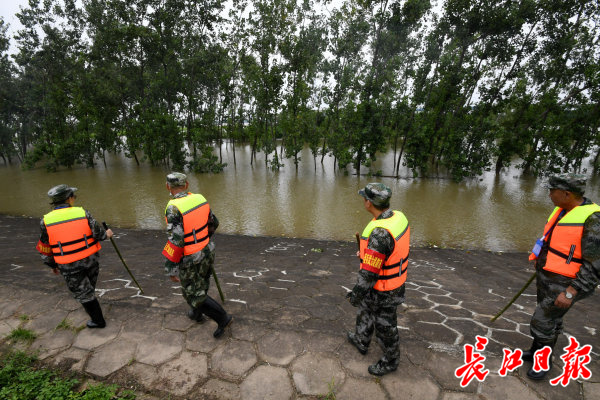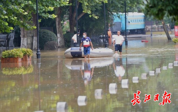 13日10时,长江汉口水位28.77米,仍呈上涨趋势。在江水漫过的汉口江滩,距离防水墙最近的内部道路水深已经有二十多厘米。工作人员或蹚水或骑车,甚至用橡皮筏在景区内巡查。