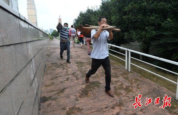 7月12日下午,武昌江滩观江平台,武汉长江救援志愿队队员抬起冲锋舟,准备巡江值守。