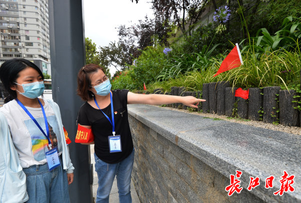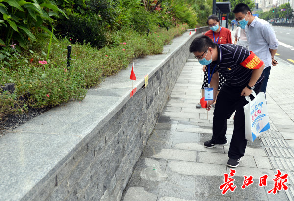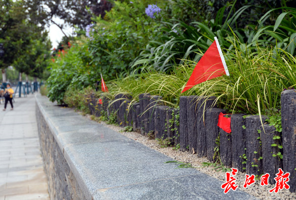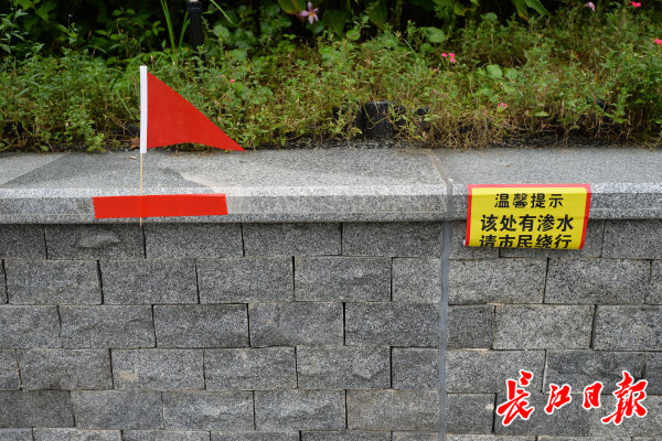 长江网7月13日讯 7月13日中午,在汉口沿江大道四唯路口防水墙下,来自江岸区四唯街的防汛工作人员正在检查一处已插上小红旗的疑似渗水点是否有变化。在这一路段的防水墙下方,沿途已经插了几面小红旗。