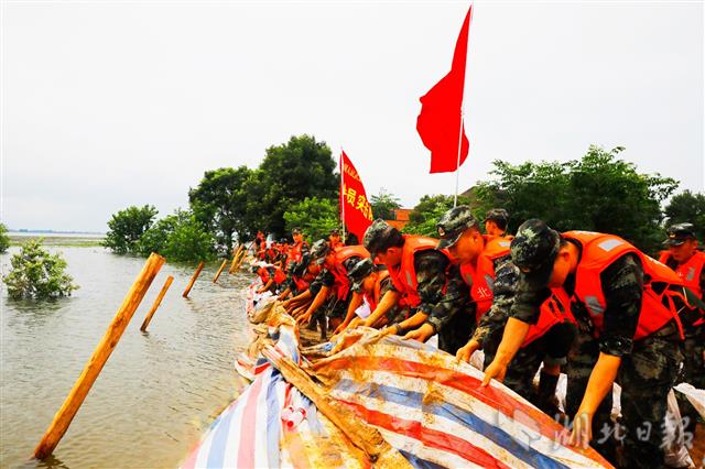7月12日,武警官兵正在大堤险段铺设防风浪塑料布。受连续强降雨影响,荆门市沙洋县长湖持续超保证水位,威胁沿线18个村1600余户群众及15000亩鱼塘安全。武警湖北总队荆门支队百余名官兵闻“汛”而动,携带救援工具迅速奔赴至后港镇险段,2小时加固堤坝280余米,加高子堤40厘米。该支队还另外派出50余名官兵,进驻毛李镇蝴蝶咀和双店村,对一些不安全、不稳定的堤坝进行加固,全力保障人民群众生命财产安全。(视界网 李龙昌 谢定安 摄)