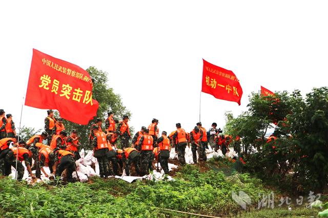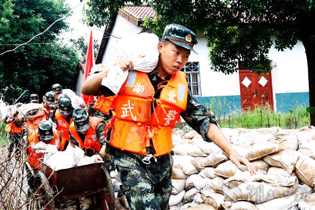 7月12日,武警官兵正在装填沙袋加固堤坝。