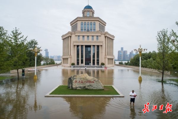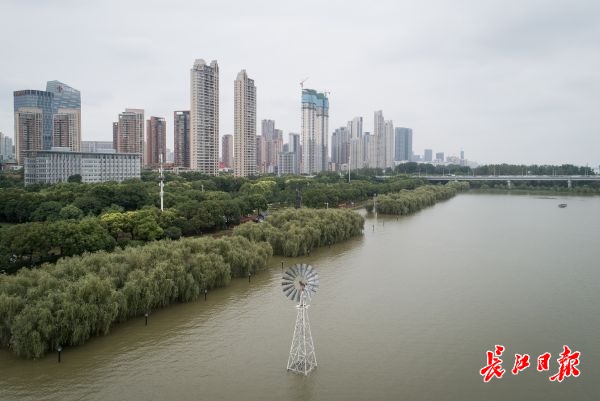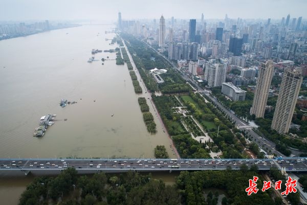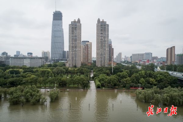 长江网7月13日讯 2020年7月13日,长江武汉段水位持续上涨,截至下午4时,长江武汉段水位达到28.75米,为历史第四高位。航拍汉口江滩,上涨的江水已经淹至一级亲水平台。 (记者任勇 摄影报道)