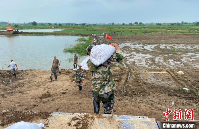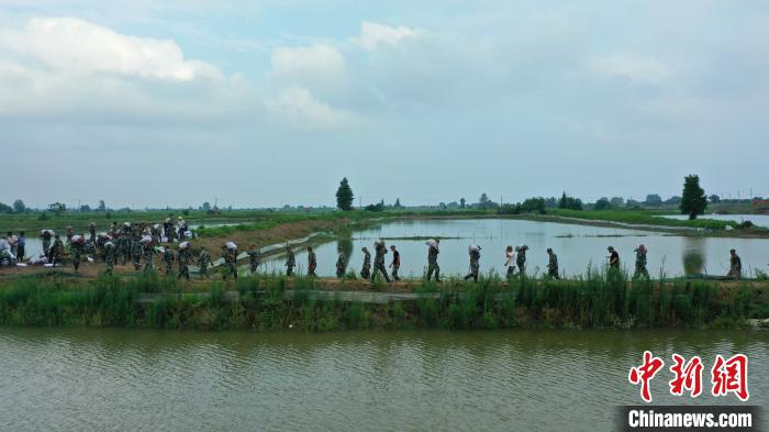 中新网湖北洪湖7月13日电 (郭晓莹 董晓斌 肖莎)湖北省洪湖市洪狮围堤汉沙村堤段发生内脱坡险情,当地13日开始组织村民和民兵抢筑子堤,设置围堰灌水,与洪湖形成反压,防止溃口。