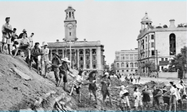 相同的守护亦发生在1954年,这是长江日报记者当年从军用飞机上拍下的武汉汛情。当年30万军民在江汉关筑防守堤,今天坚毅的江堤、众志成城的守堤人为我们守护着这座城。