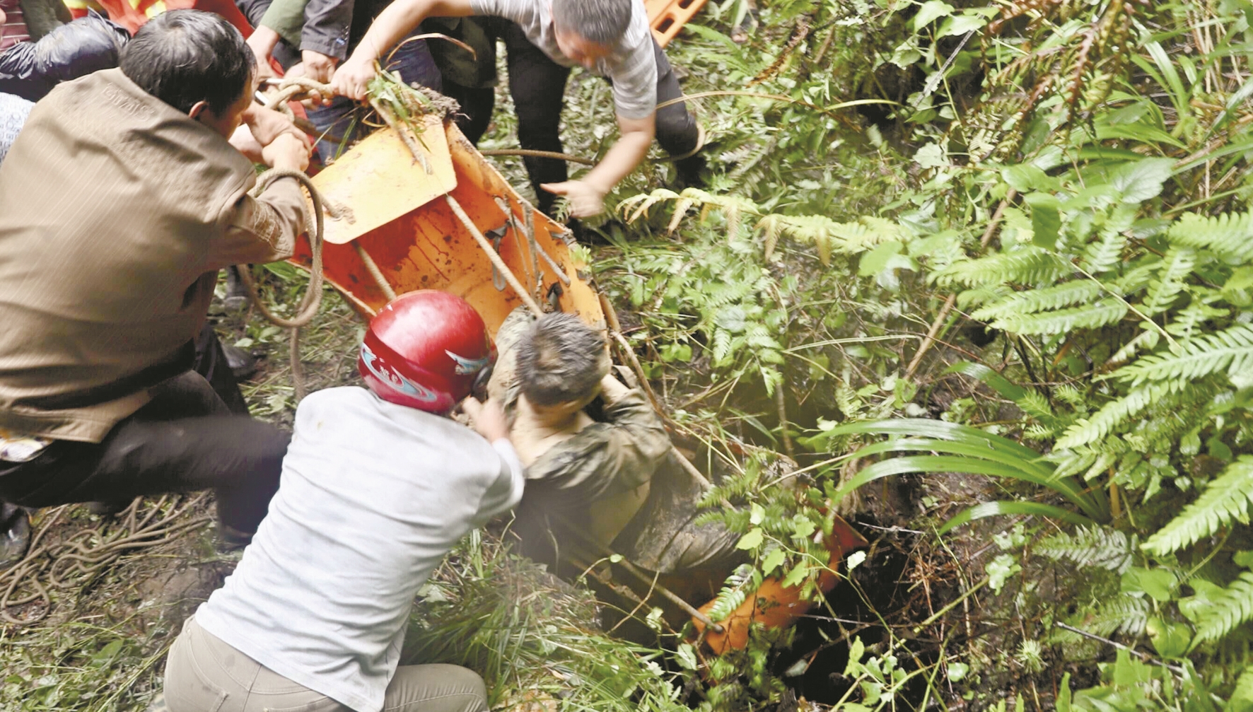 根据现场情况,救援人员利用周边树木搭建支点,一名消防员携带多功能担架、安全吊带、救援绳、空气呼吸器等器材装备,用两根安全绳垂直速降天坑内。为避免被困者遭受二次伤害,下到天坑内的消防员用绳索和绑带将被困男子固定在多功能担架上,天坑外救援人员和当地村民齐心协力,将两根绳索同时向上缓慢拉动。经过一个多小时的努力,成功将被困男子救出天坑,并移交给现场的医护人员。