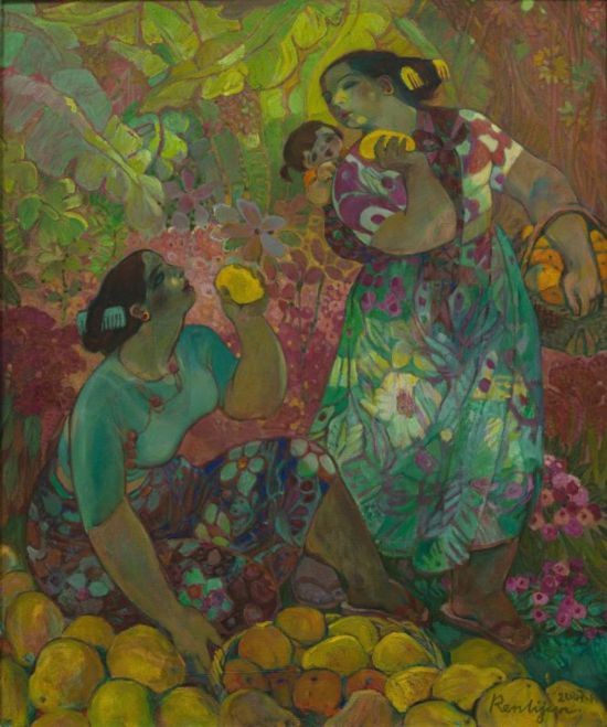 油画《傣族妇女》,是画家任丽君在花甲之年创作。作品借少数民族女性题材,用鲜艳、饱满、大胆的色彩以及独特的光线,描绘出一种健康、阳光、富庶的生命状态。作为一名女性画家,任丽君从1980年代后半期开始,就以少数民族女性为其创作的主题,一直延续至今。多年来,她用油画笔,生动地刻画了无数个健硕、勤劳、烂漫的妇女形象。她尤其擅长用色彩来表达自己的情感和思想,正如她自己所说的:“色彩语言不同于文字语言,色彩语言是对整体感觉的一种直观表达,所谓油画就是要用色彩来表达……我生活在灿烂的社会,其中反射出的丰富的彩色和充满活力的能量,激励着我创作出灿烂的作品。”