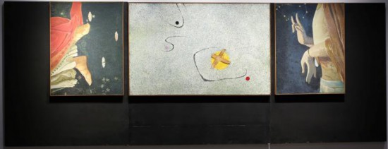 《太和——廿一世纪》是一幅三联画。中间的一幅是抽象的,左右两幅是写实的。这种表现手法也是艺术家陈创洛借鉴西方后现代表现主义的影响所绘。中间的一幅画,在无垠的宇宙中,象征地球的一个黄色圆点被纱布贴成“X”形,在它左上方的黑色弧线和小黑点构成了表示呼救的英文缩写语 “SOS”,而这些线与点在更大范围内又形成了一个隐隐约约的骷髅头,这个画面似乎是在发出一个危险警告,使人能够体会到内中藏匿的忧患意识。左右两幅画分别代表了西方文化和东方文化:右幅截取的是中国菩萨塑像的双手和身躯,他一手上翘,意示抚慰;另一手下垂,表示祈愿。晴朗的夜空中闪烁着星斗。左幅截取的是意大利文艺复兴早期画家波提切利的《春》中的维纳斯的双脚,草地上盛开着各种小花。陈创洛通过一系列的对比,很有意味地表达了一个深刻的思想——和而不同。文化的不同不应造成为对立和冲突的理由,和谐便是理念上的求同存异。祈求世界和平,倡导生态平衡,改变地球变暖等等,这一切都是画家创作此画的出发点。