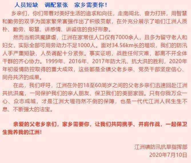 九洲、良种场等靠近北堤附近住户,7月12日必须转移,其他地方四类对象7月13日全部完成转移。镇上的青壮年劳动力继续投入到江洲镇防汛工作当中。