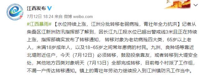7月12日,江西省九江市柴桑区江洲镇防汛抗旱指挥部发布通知:目前,长江九江段水位已超出警戒线3米,且正在持续上涨。江洲镇居民于7月13日前分批转移。转移对象为老幼病残四大类,65岁以上老人,未满18岁成年人,以及18~65岁之间常年患病的村民。