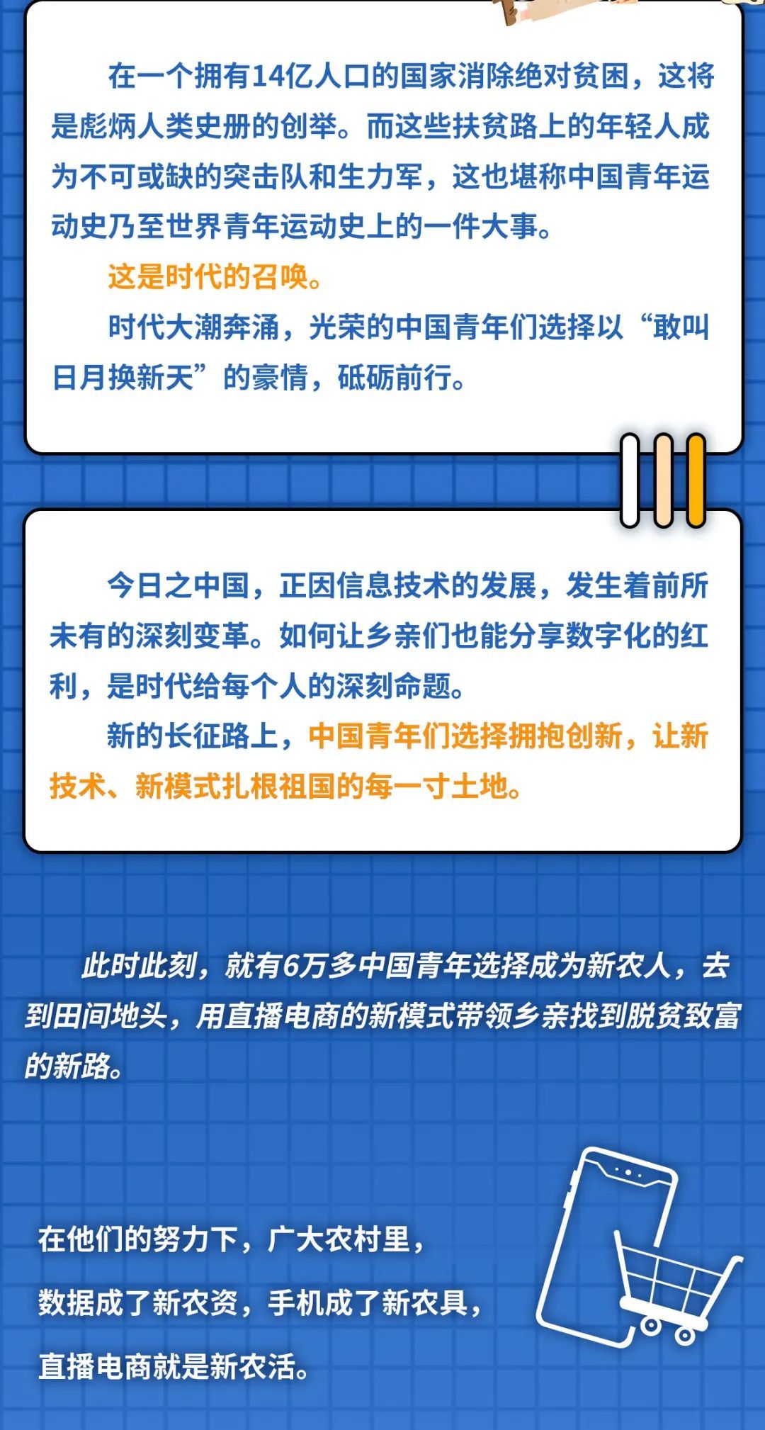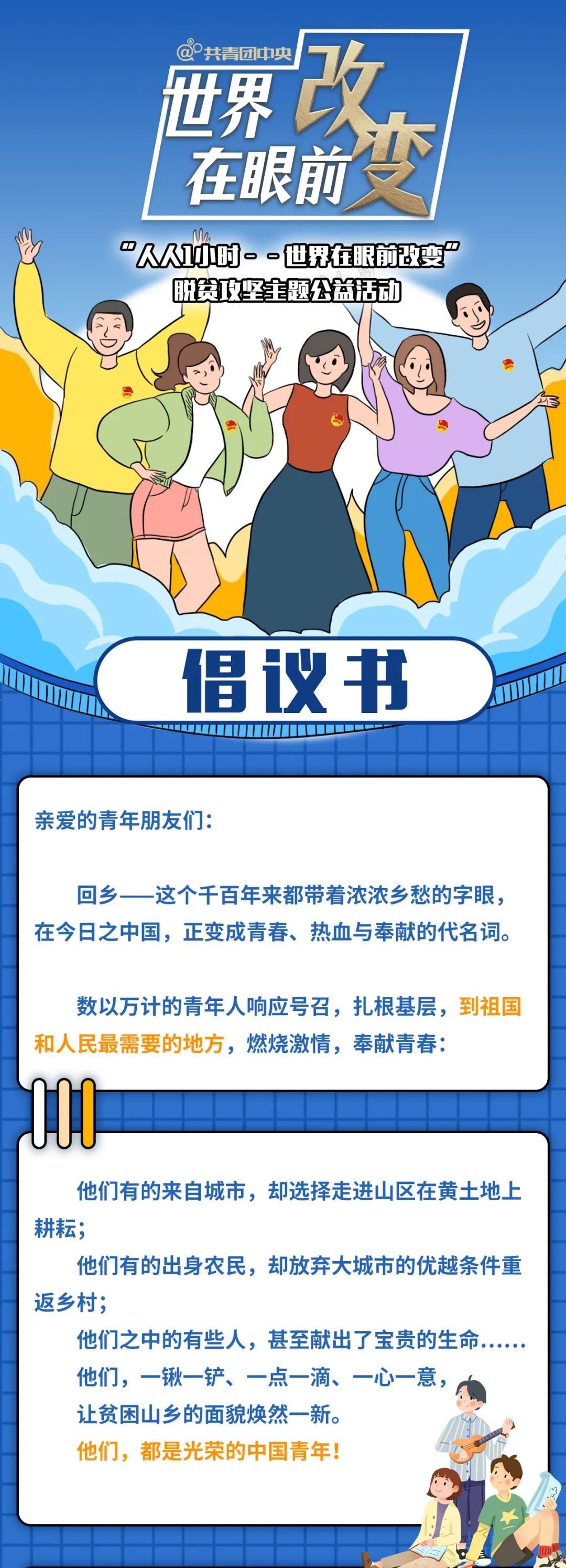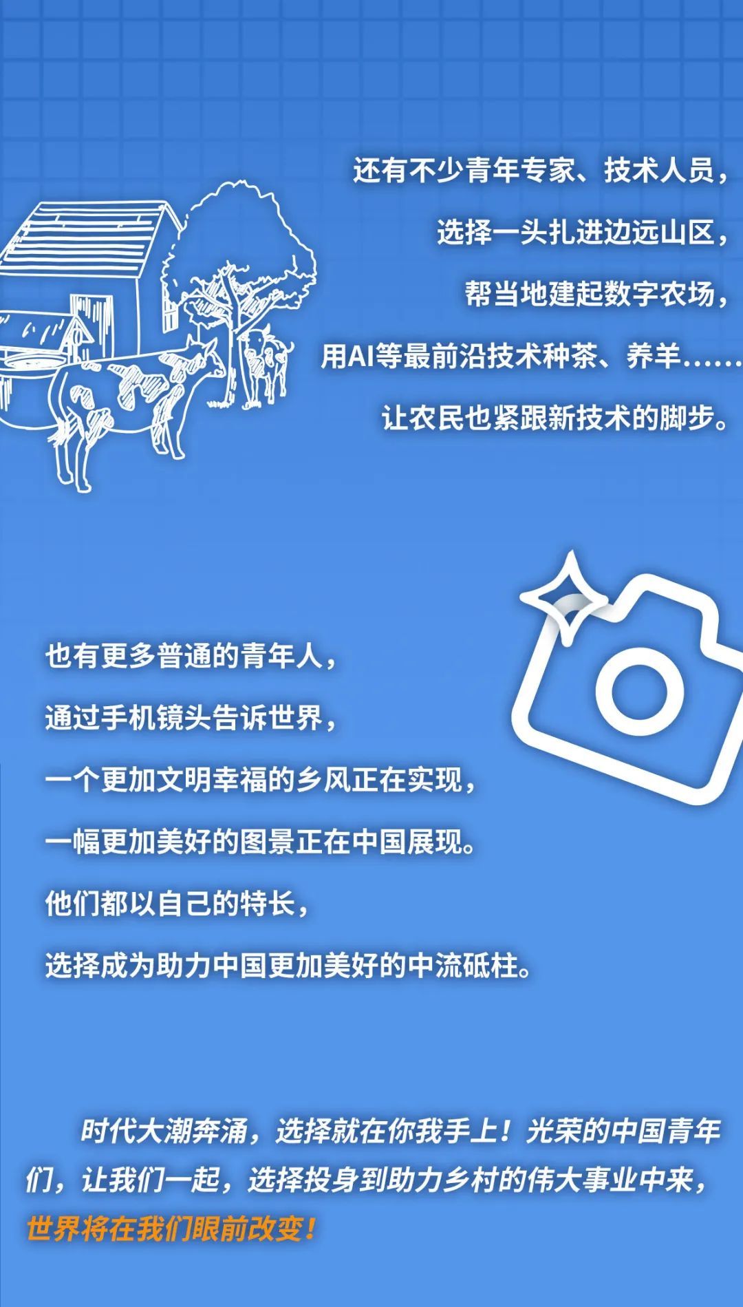 时代大潮奔涌,选择就在你我手上!光荣的中国青年们,让我们一起,选择投身到助力乡村的伟大事业中来,世界将在我们眼前改变!
