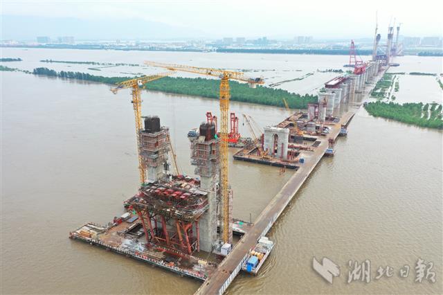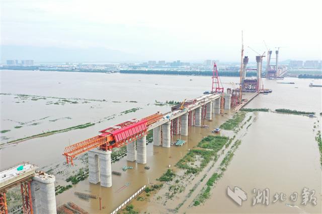 2020年7月14日,长江鳊鱼洲被洪水淹没,位于黄梅县小池镇与江西省九江市柴桑区之间鳊鱼洲长江大桥正在紧张施工。