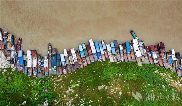7月13日,在秭归县归州镇香溪轮渡码头渔船收集现场,退捕渔船整齐的停靠在岸边等待拆解。