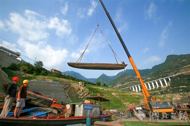 7月9日,在秭归县归州镇香溪轮渡码头渔船收集现场,工人将渔船吊上岸进行拆解。今年5月1日0时起,长江流域秭归段水域,包括县域内的长江干流和长江支流等通江水域实行全面禁捕。为切实将长江禁捕落到实处,秭归县将全县500多艘渔船集中收集,进行拆解和景区观光再利用,并通过实物补偿、生活补助、社会保障、鼓励创业等多种办法,妥善安置退捕渔民。(视界网 郑家裕 王罡 摄)