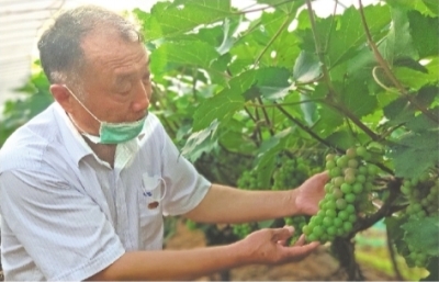 近日,蔡崇海在大路村果园里查看葡萄长势。