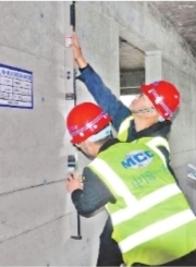 一冶交通公司项目员工在施工现场进行墙面平整度检查。