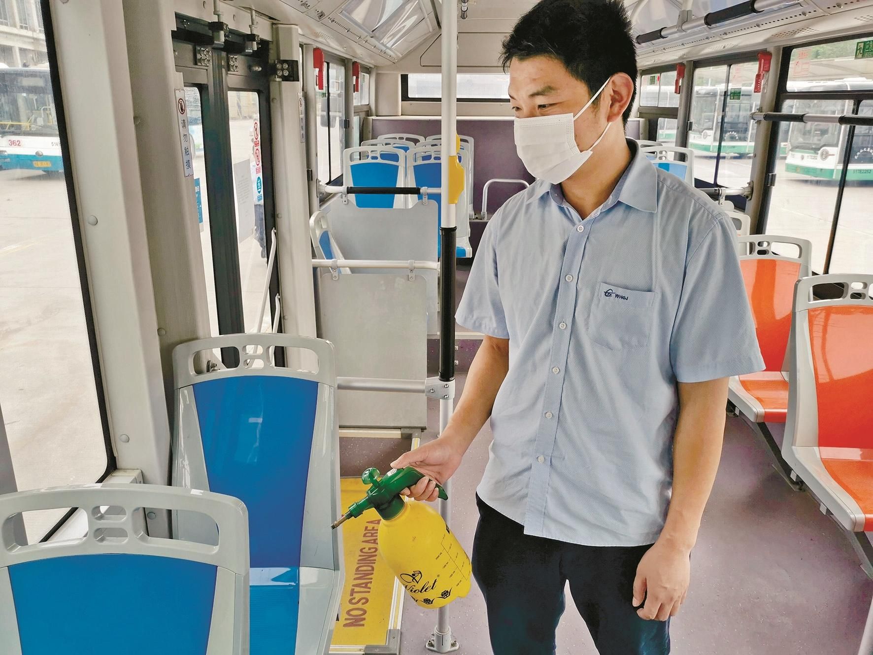 7月11日,武汉公交东山场站,362路安全员张天明提前来到岗位,站点工作人员为他测量体温,查看身体状况,并做好记录。对车辆出车前进行“十检”后,张天明拿起装有84消毒液的喷壶,对车厢内乘客经常接触到的扶手、座椅、底板等处,进行喷洒消杀。