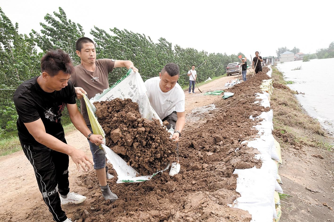 7月13日,在黄梅县新开镇团洲圩长江子堤上,杨泗庙村几个年轻人正在装土加固堤防,他们是从广州、杭州和武汉等地赶回来抗洪的。据介绍,该村返乡抗洪保家园的青壮年有20多人。